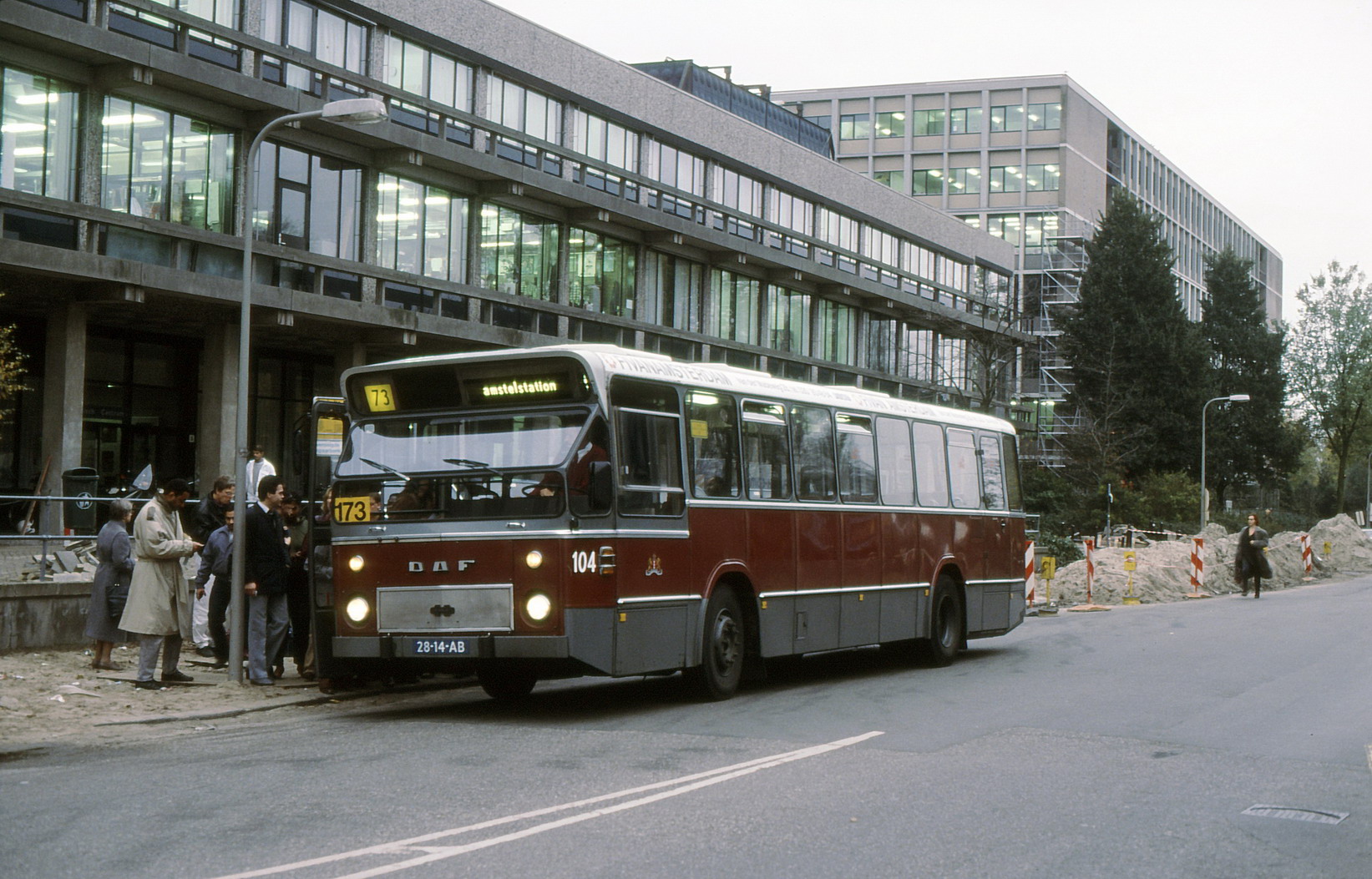 ![]() GVB 104, CN-Lijn 173, van der Boechroststraat, 8 november 1990. Foto: René van Lier. |