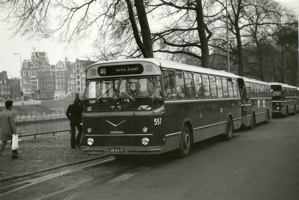 GVB 557, Lijn 40 (spitsvervoer van Centraal Station naar Fordfabriek), Stationsplein (standplaats Centraal Station-ENTOSSPOOR), 26 maart 1974.