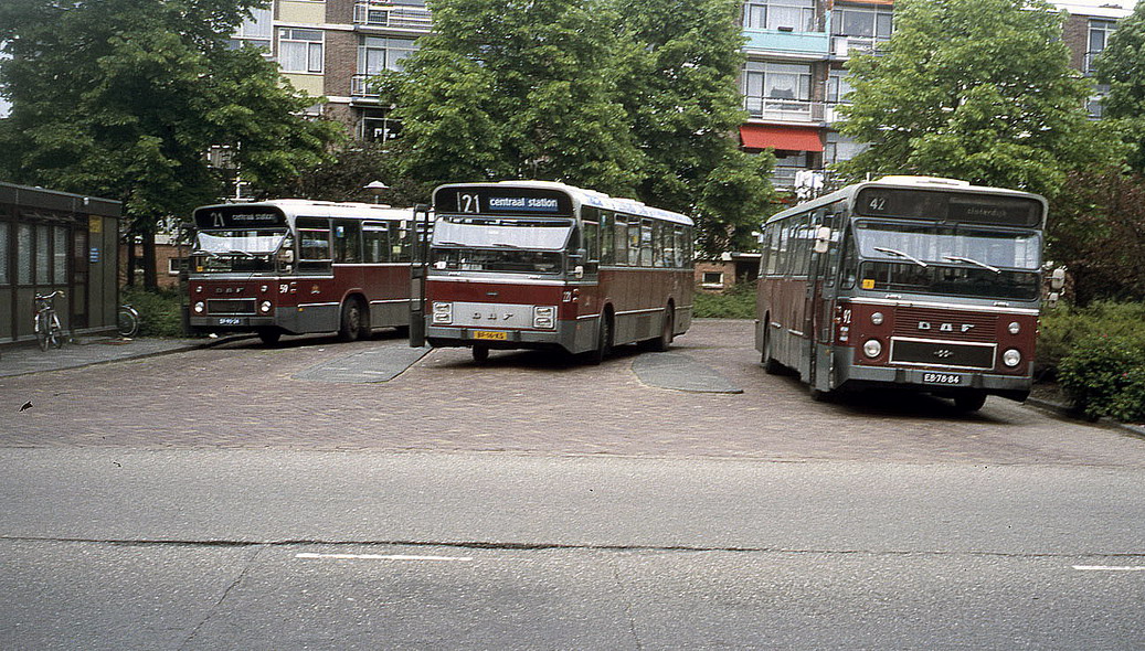 ![]() GVB 59, 221, 92; Lijn 21, 21, 42; De Sarvonin Lohmanstraat (standplaats Geuzenveld), 1987. Fotograaf: Frans van Britsom. |