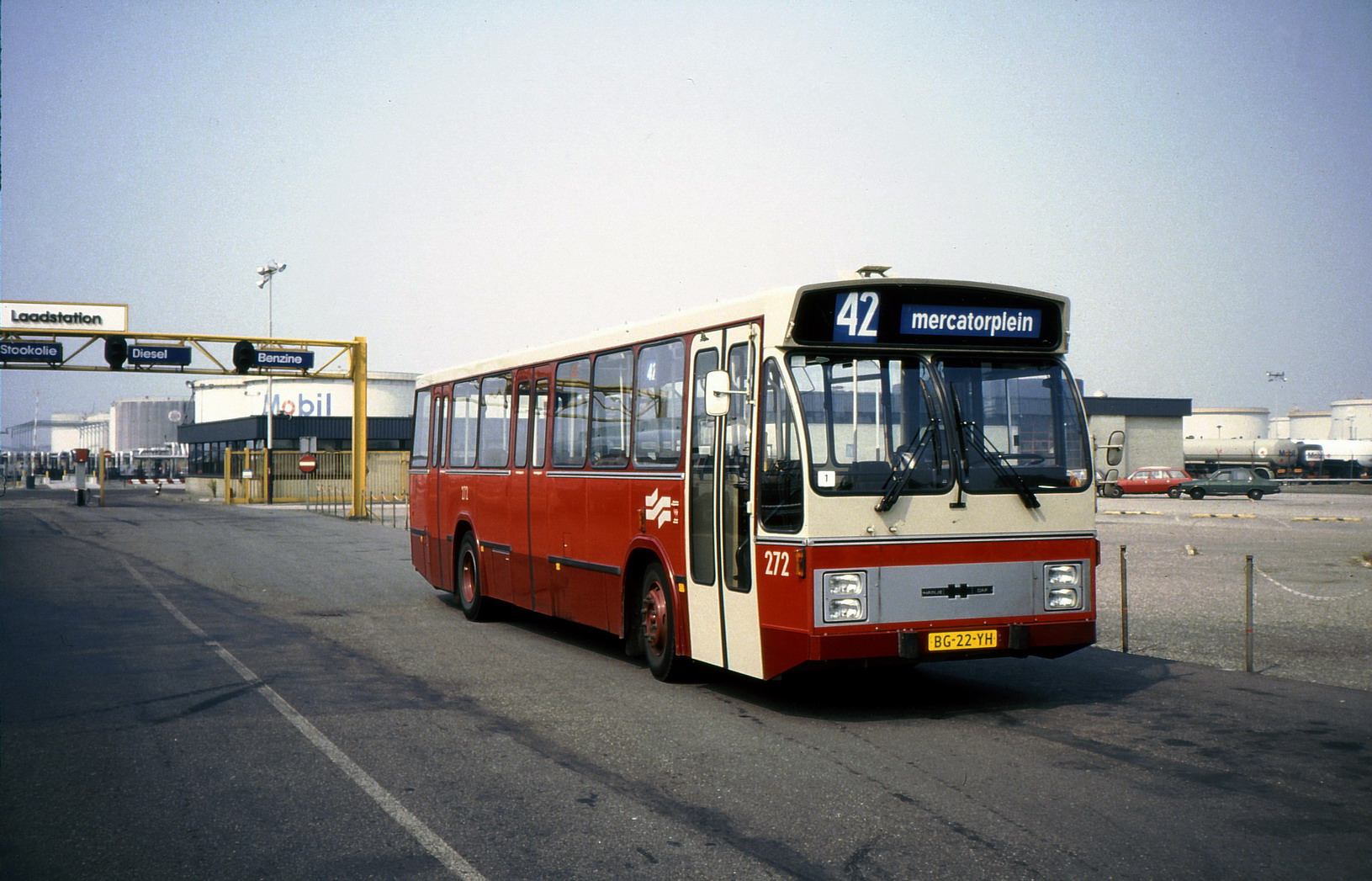 ![]() GVB 272, Lijn 42, Hornweg (standplaats Mobil Oil), 16 augustus 1984. Foto: Jan Jaap Carels (verzameling René van Lier). |