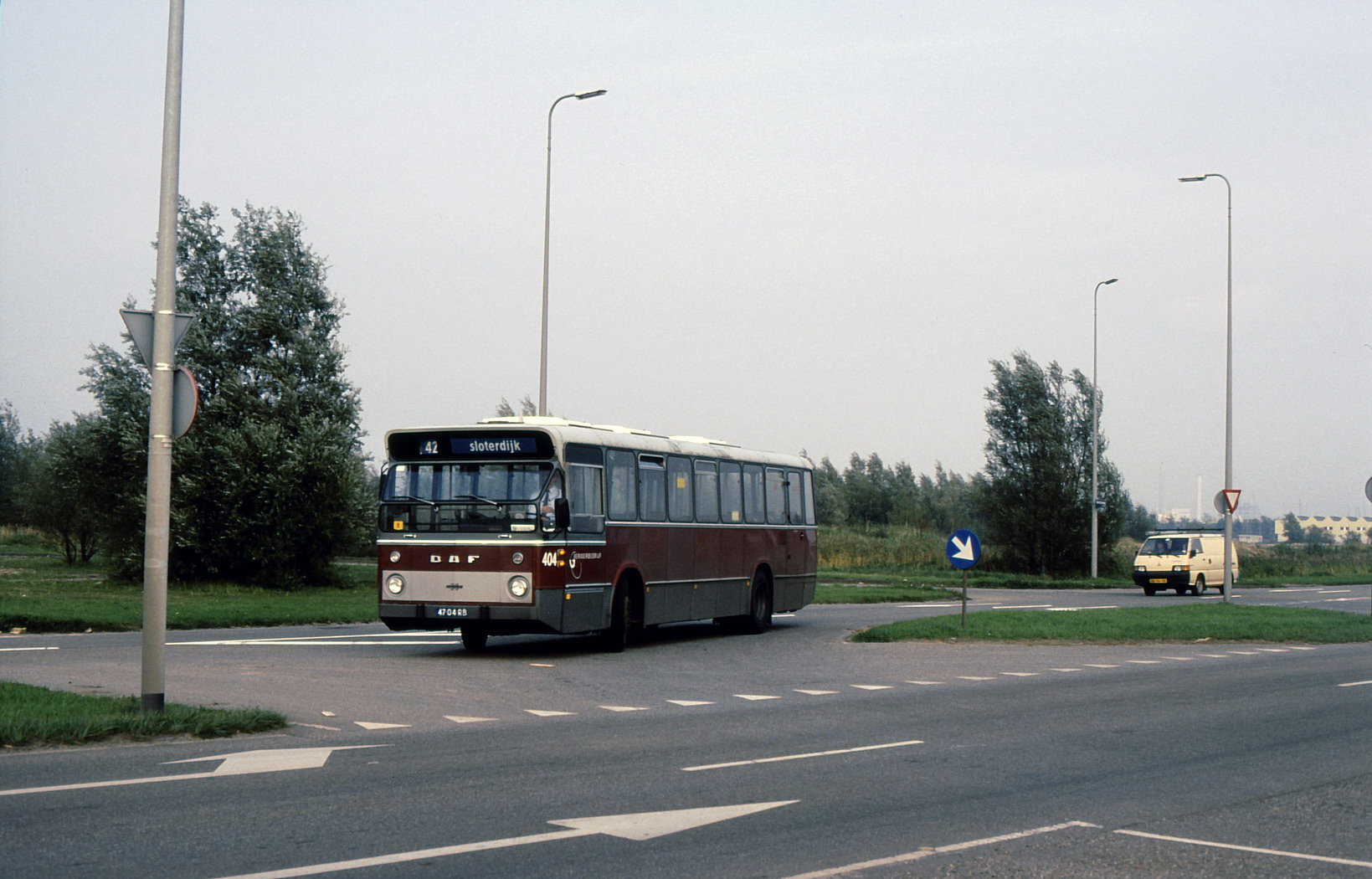![]() GVB 404, Lijn 42, Noordzeeweg/Aberdaan, 2 oktober 1990. Tijdelijke ingehuurde CSA1-bus 51 van het GVB te Groningen. Foto: René van Lier. |
