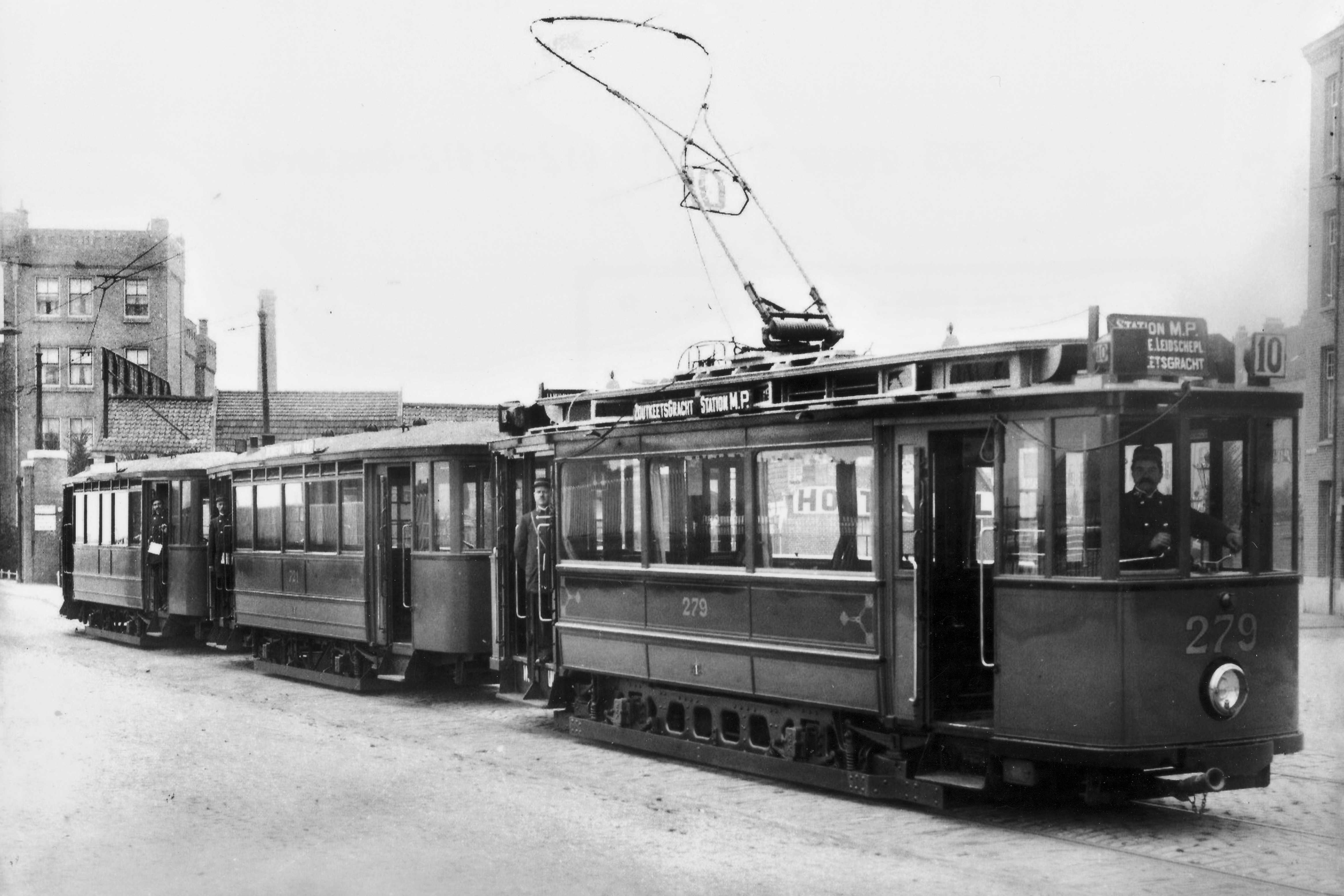 ![]() GTr. 3 (nog met trolleystang), Lijn 10, Marnixstraat (standplaats Leidscheplein), augustus 1900. Prentbriefkaart. |