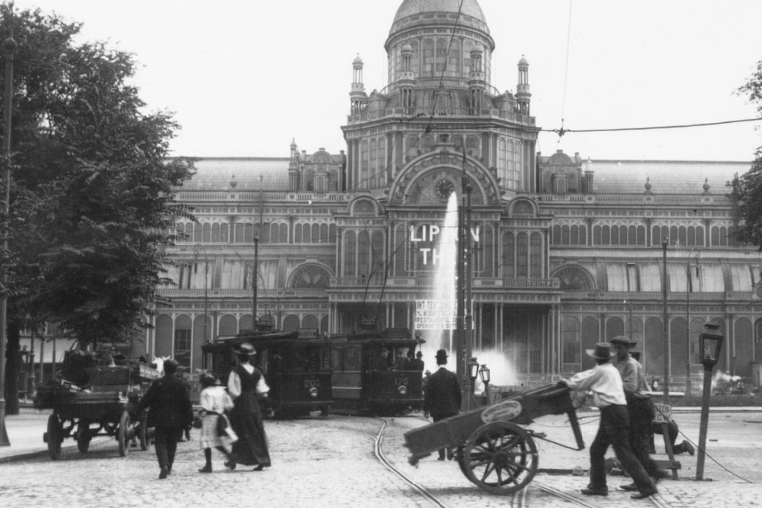 ![]() GTr. 205 en 175, Lijn 5 en 11, Frederiksplein (met het Paleis van Volksvlijt), circa 1905. Fotograaf: onbekend (verzameling René van Lier). |