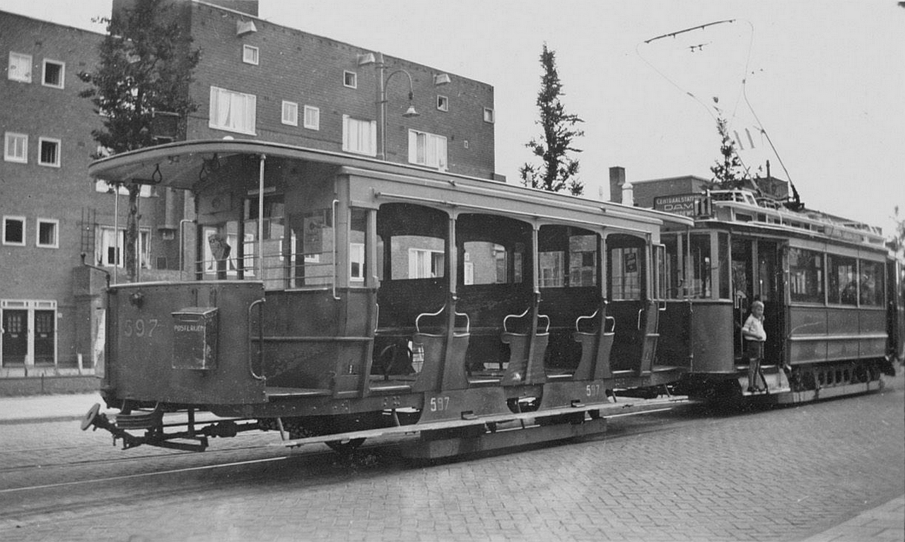 ![]() GTr. 597+Grootbordesmotorwagen, Lijn 11, Insulindeweg, 1941. Fotograaf: onbekend (verzameling René van Lier). |
