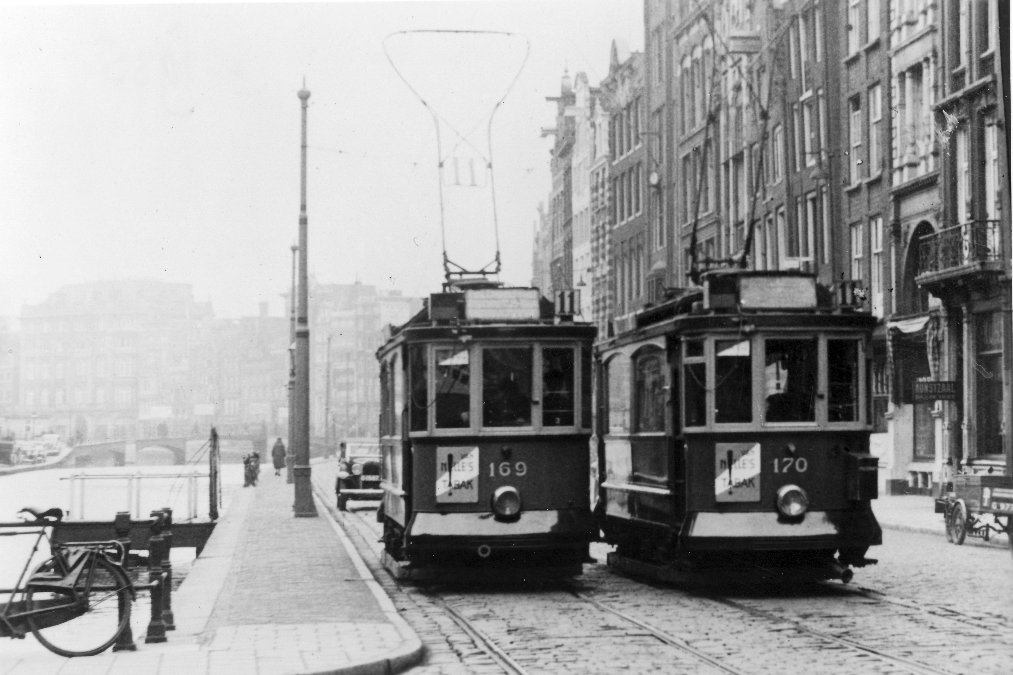 ![]() GTr. 169 en 170, Lijn 11, Rokin, 30 maart 1935. Foto: NV. De Arbeiderspers. |