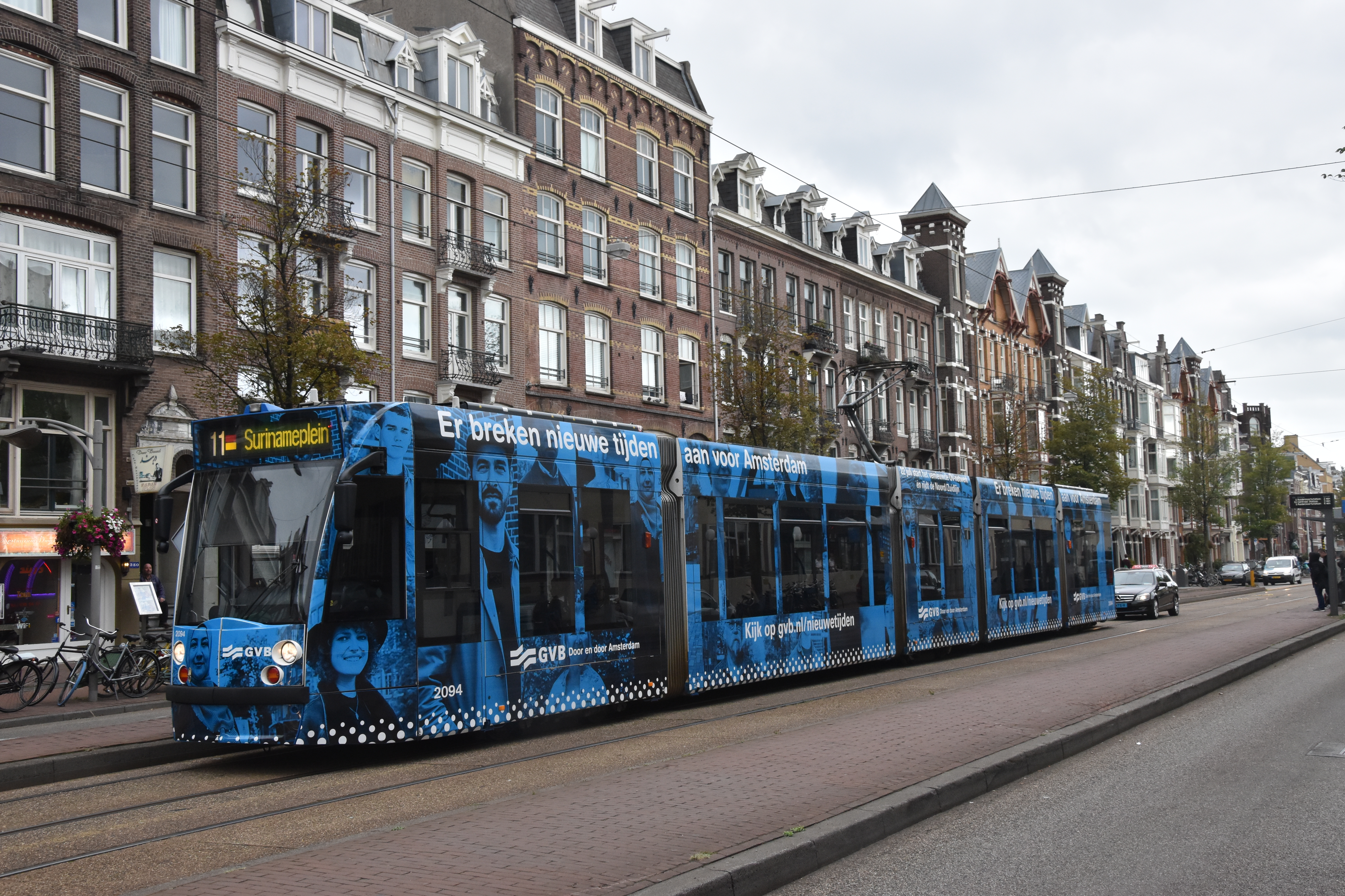 ![]() GVB 2094, Lijn 11, Overtoom, 27 augustus 2018. Totaalreclame voor het nieuwe lijnennet van GVB na ingebruikname van de Noord-Zuid-metrolijn 52. Foto: René van Lier. |