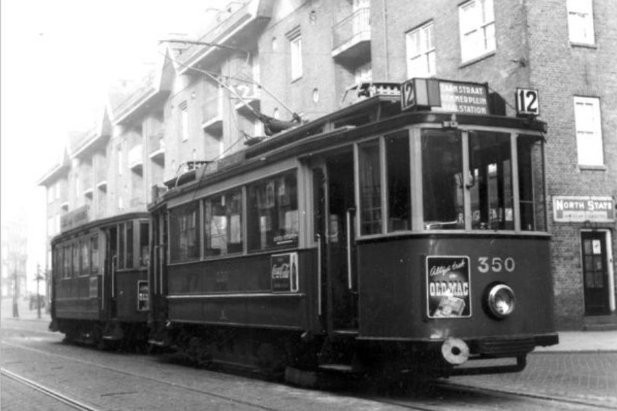 GVB 350+723, Lijn 12, Oostzaanstraat, 5 december 1954.
