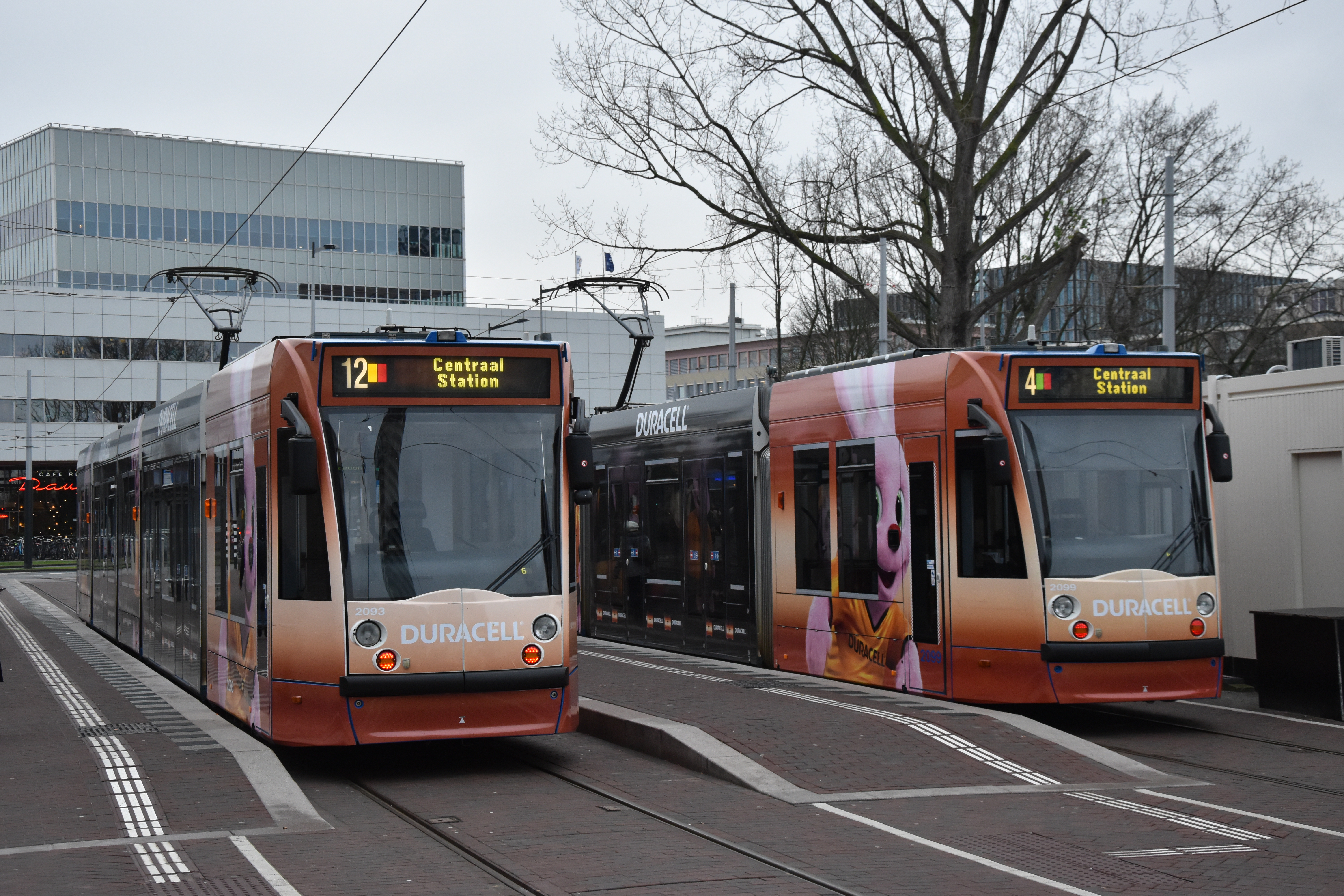 GVB 2093 en 2099, Lijn 12 en 4, Julianaplein (Amstelstation), 19 december 2018.