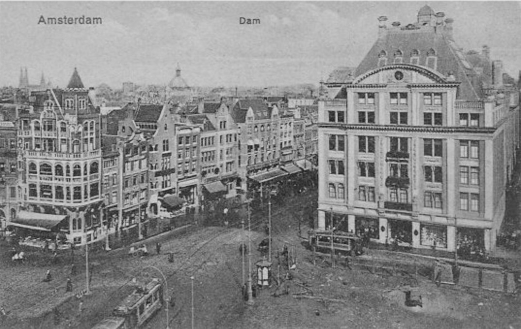 Lijn 18 heeft net de lus rond de Bijenkorf bereden en staat nu vertrekgereed op de Visschersdam (de huidige Dam).