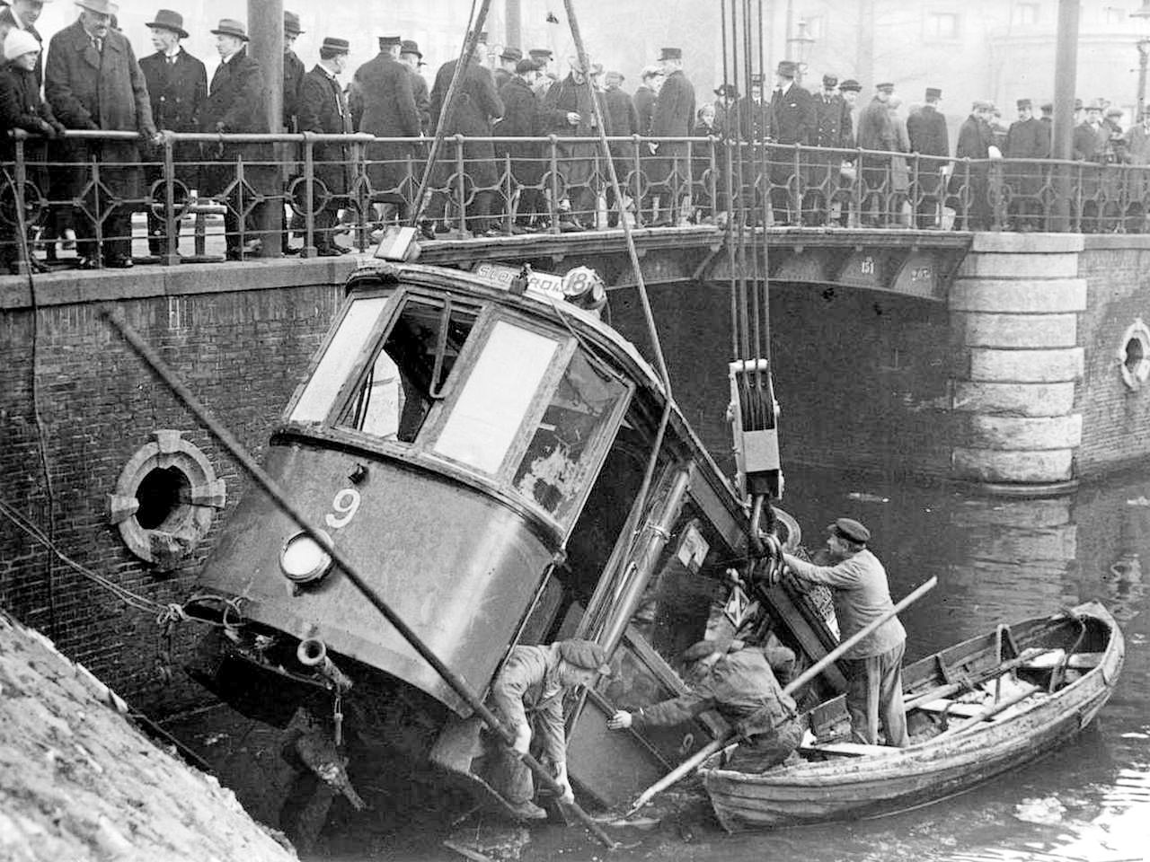 Takelwerkzaamheden ten bate van het uit het water hijsen van de tramwagen.