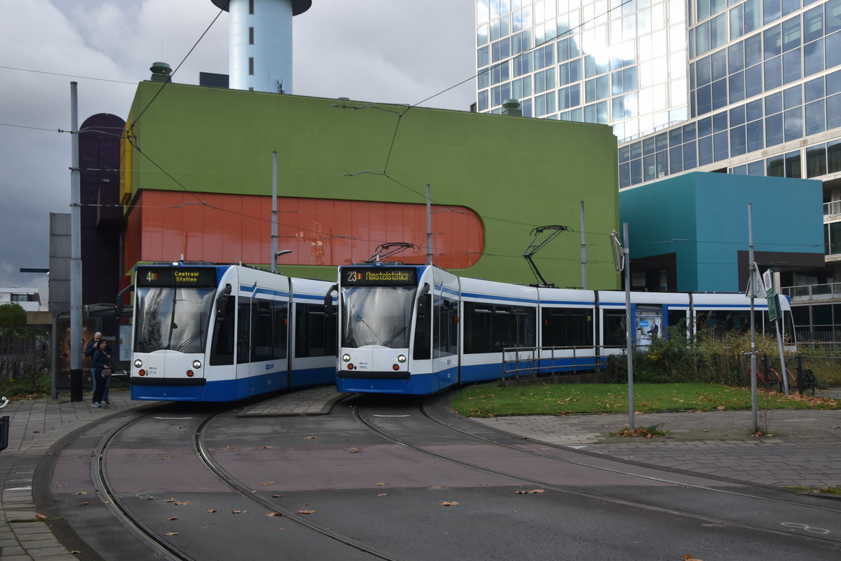 GVB 2118 en 2082, Lijn 4 en 23, Europabouelvard (standplaats Drentepark / Station RAI), 13 november 2021. Foto: René van Lier. |