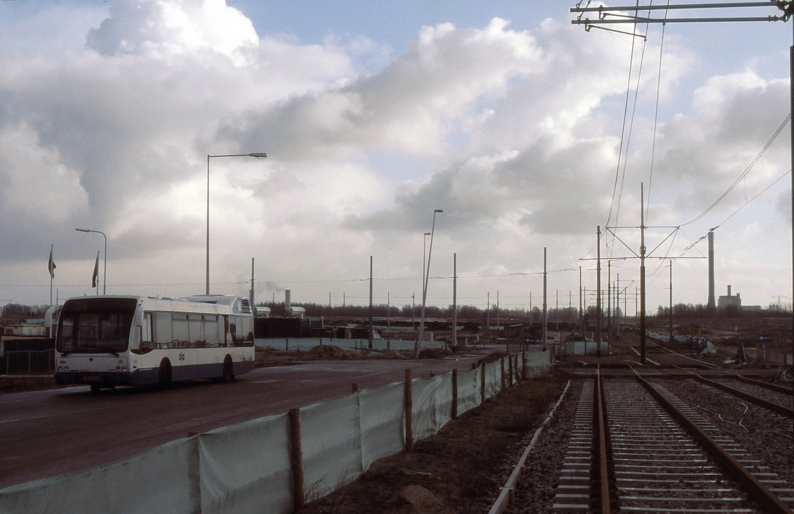 ![]() GVB 167, Lijn 326, IJburglaan, 25 januari 2004. Aanleg tramlijn 26 ter hoogte van Ringweg A10. Foto: René van Lier. |
