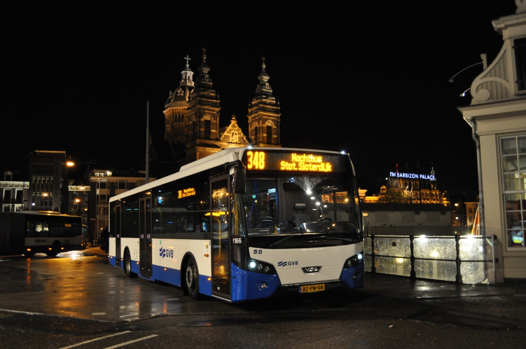 ![]() GVB 1166, Lijn 348, Stationsplein, 4 november 2012. Foto: Remy Den Hartog. |