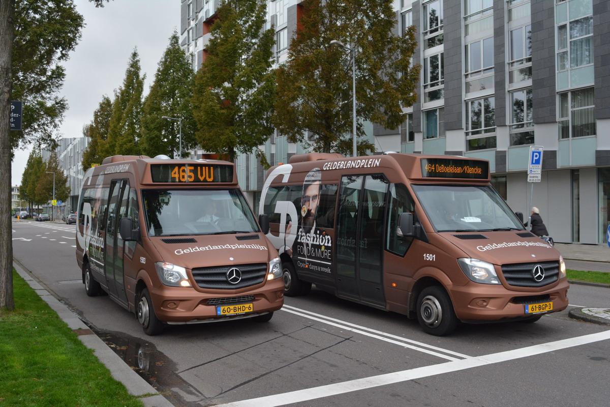 ![]() Kroonenburg Groep 1503 en 1501, Lijn 465 en 464, Arent Janszoon Ernststraat, 25 oktober 2017. Foto: René van Lier. |