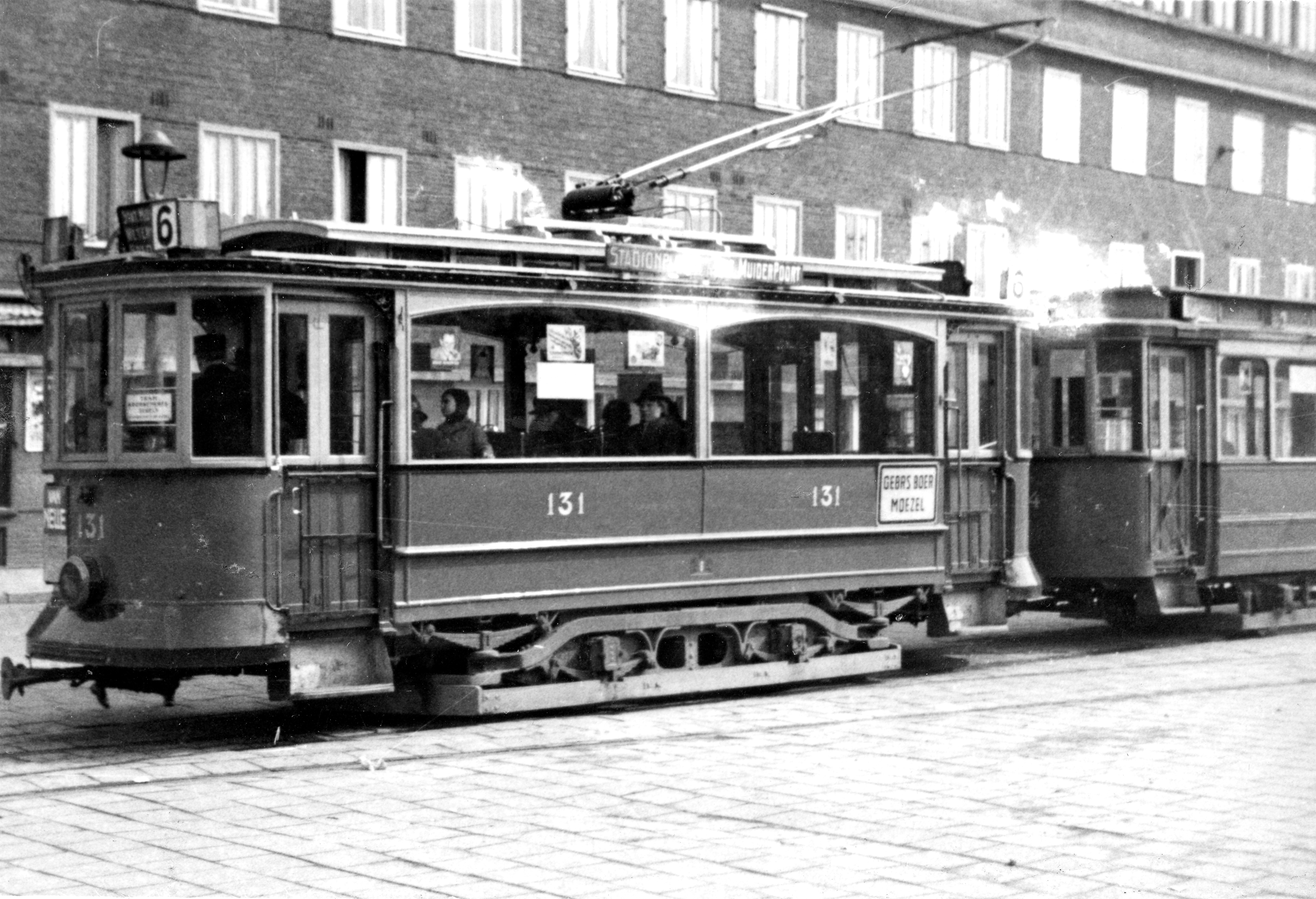 ![]() GTr. 131+694, Lijn 6, Celebesstraat (standplaats Muiderpoortstation, maart 1942. Fotograaf: onbekend (verzameling René van Lier) |
