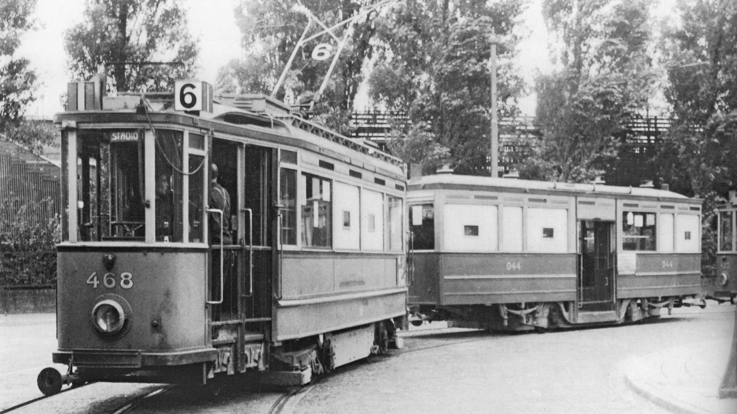 ![]() GVB 468+944, Lijn 6, Stadionstraat, 21 september 1947. Foto: G.J. de Swart (verzameling René van Lier). |
