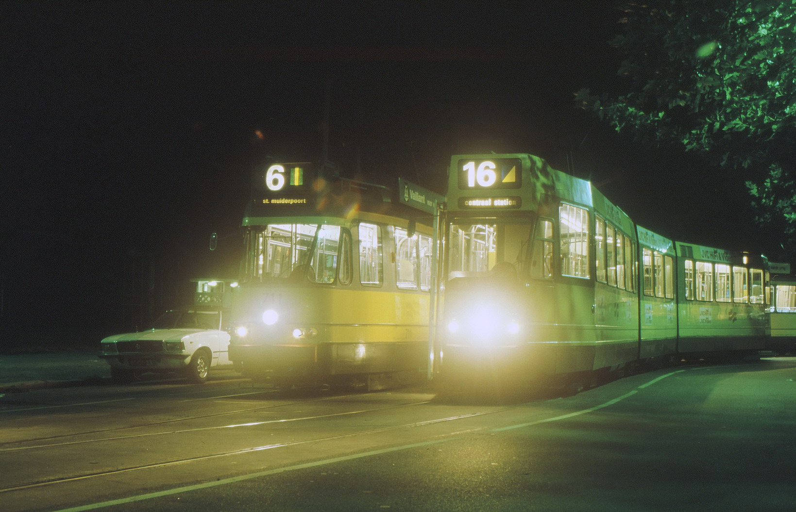 ![]() GVB 711 en 811, Lijn 6 en 16, Stadionstraat, jaren "80. Foto: Johan Waaijer. |