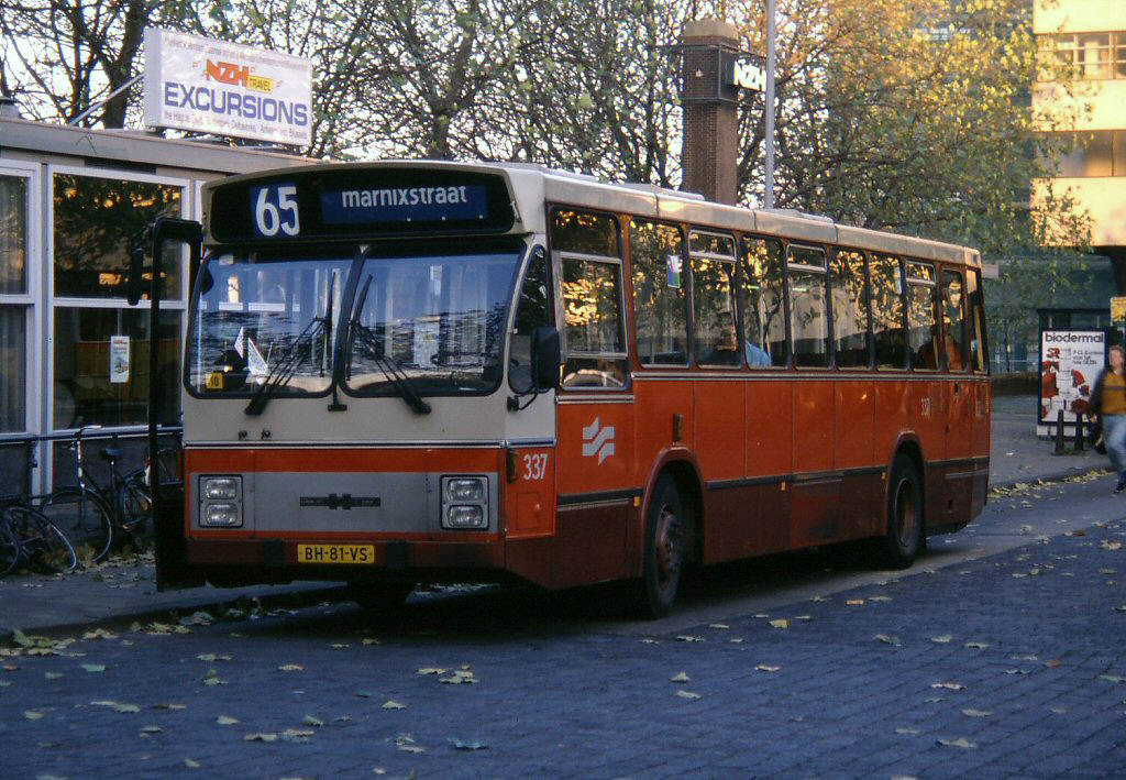 ![]() GVB 337, Lijn 65, Busstation Marnixstraat, 17 november 1990. Fotograaf: onbekend (verzameling Jos van der Klundert). |