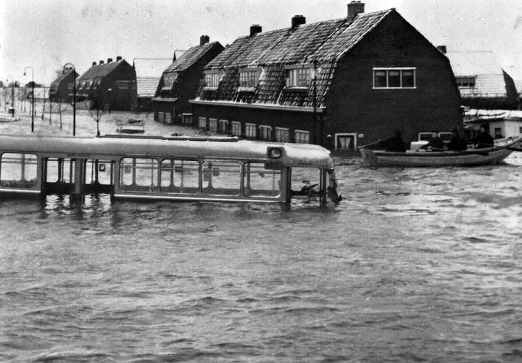 GVB 65, Lijn C, Meteorenweg, 14 januari 1960. Bus gestrand door defect bij de evacuatie van de bewoners van Tuindorp Oostzaan na de dijkdoorbraak, waardoor deze bus 2 weken eveneens grotendeels onder water verdween. Fotograaf: onbekend (verzameling René van Lier). |