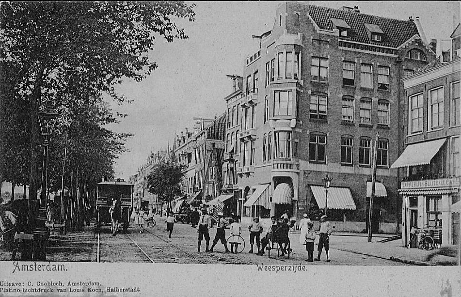 ![]() AOM 57, Lijn CW, Weesperstraat/Weesperplein, mei 1903. Foto: Jacob Olie. |