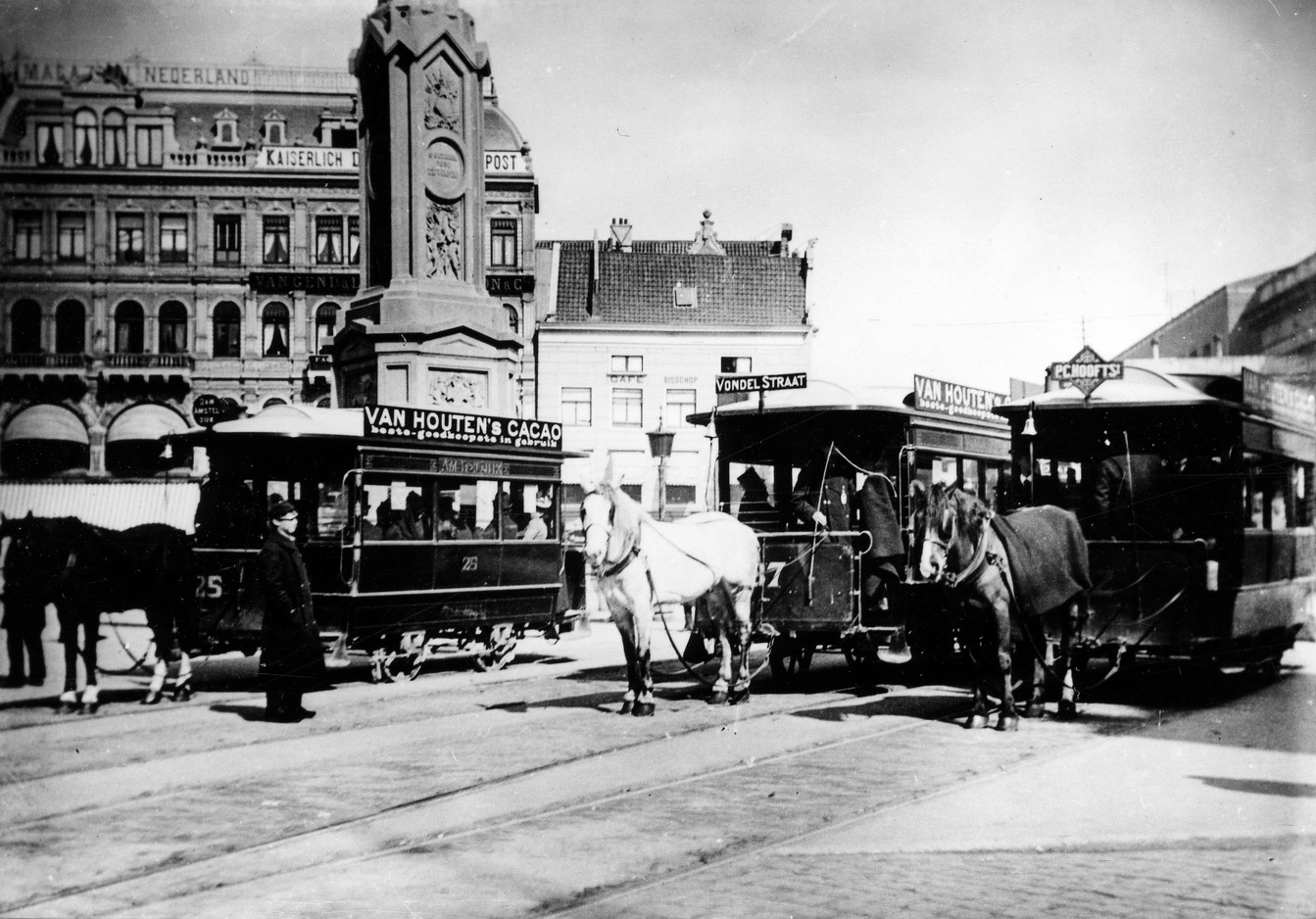 ![]() AOM 25, 37 en 82, Lijn DA, DV en DPc, Dam, circa 1892. Fotograaf: onbekend (verzameling Tim Castricum). |