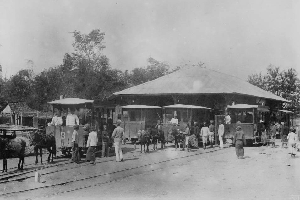 Remise Solosche Tramweg-Maatschappij met oa. SoTM-rijtuig 8(ex-AOM-158), circa 1900.