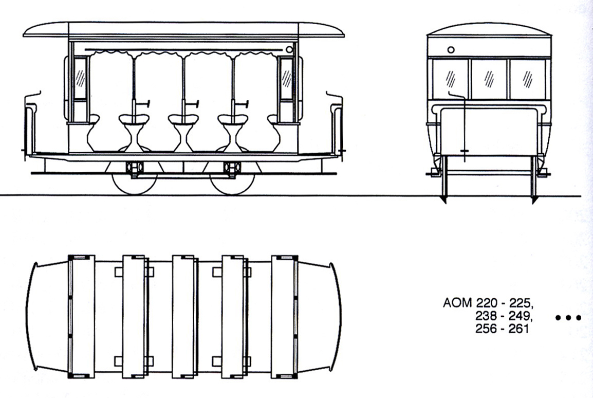 De paardenartsen Mazure en Goethals hadden de AOM er toe gebracht om alle niet verbouwde standaard open paardentrambijwagens, die nu eenmaal meer passagiers konden vervoeren dan de standaard dichte wagens door twee paarden te laten trekken. Dit was reden voor de AOM om te trachten een open wagen in dienst te brengen die echt door één paard zou kunnen worden getrokken. Als proef verschenen toen twee wagens, de 212 en 213, van een eigen ontwerp op de straat. Het werd een succes, wellicht mede omdat het publiek zeer ingenomen was met de omklapbare rugleuningen, waardoor meer vóóruit kon worden gereisd. De wagens waren bij aflevering voorzien van hoger geplaatste luifels en regenlijsten. De remblokken zaten aan de binnenkant van de wielen.