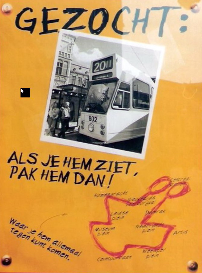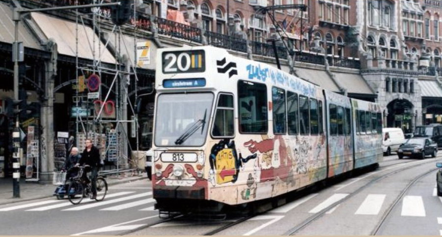 ![]() GVB 813, Lijn 20, Raadhuisstraat, 1997. Fotograaf: Tom Mulder. |