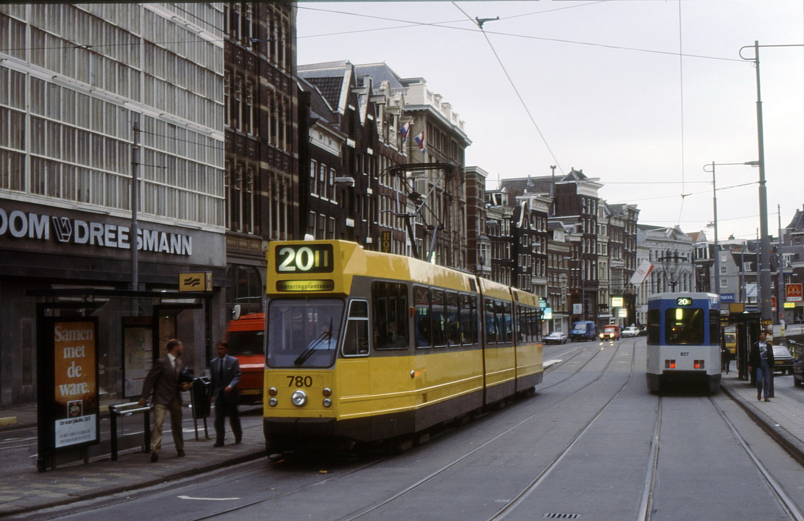 ![]() GVB 780 en 827, Lijn 20, Rokin (Halte Muntplein), 16 augustus 1991. Foto: René van Lier. |