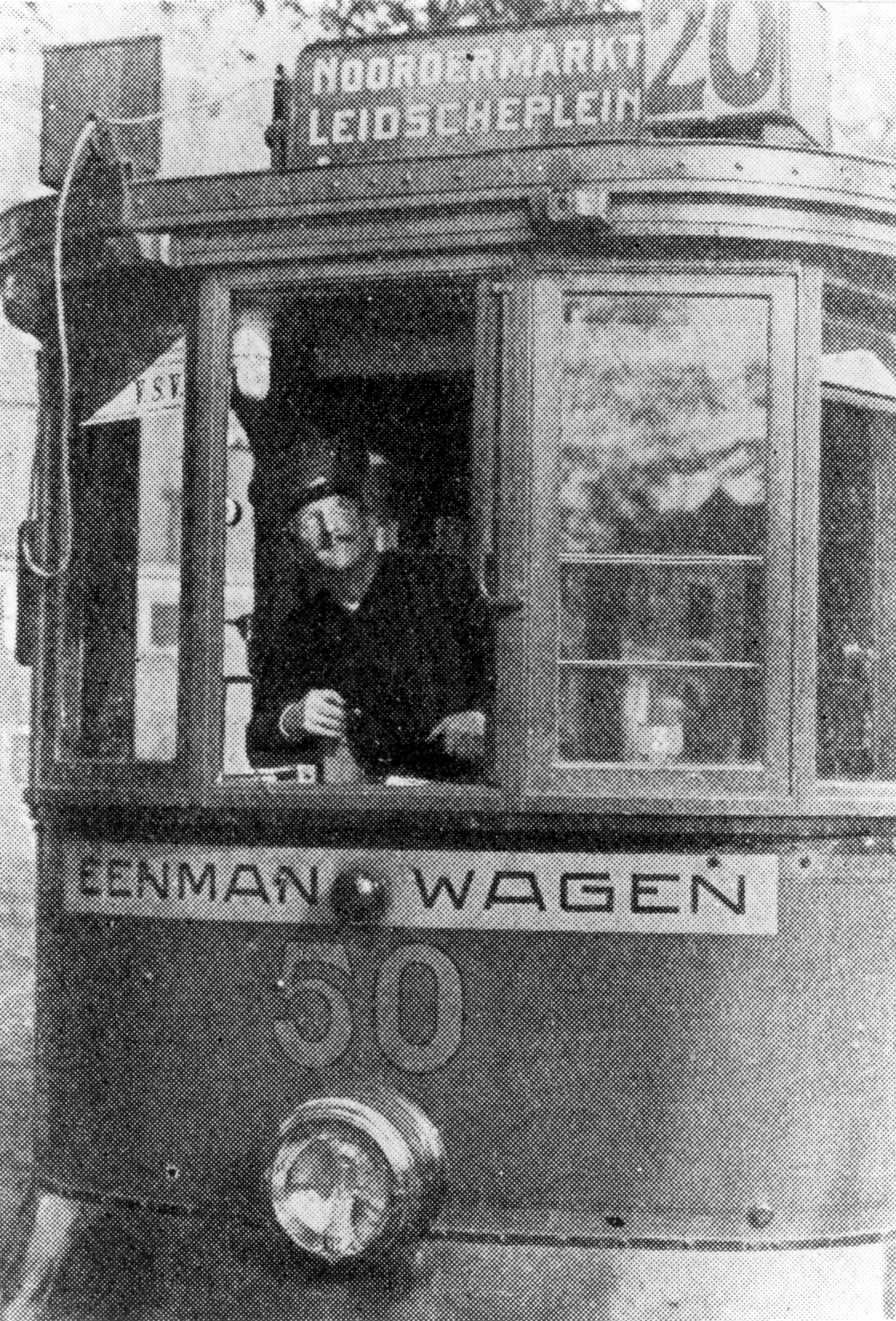 Invoering Zelfbediening - Afschaffing Conducteur. (Dienst met de zgn. EMW's (Eénmanwagens). (08-01-1925 kwamen de eerste EMW's in dienst en vanaf 06-02-1925 reed de lijn geheel met EMW's). |