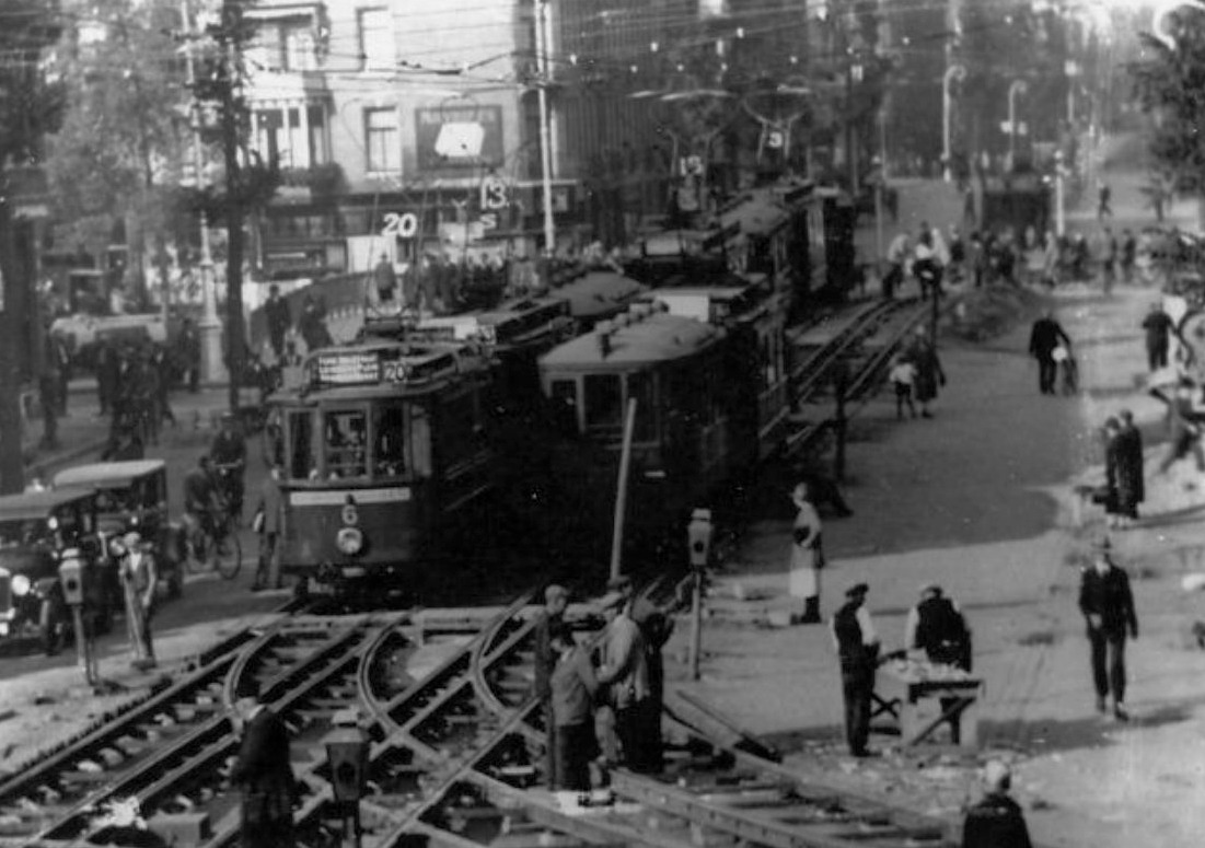 ![]() GTr. Union-emr., Lijn 20, Amsteldijk, 1930/1932. Bouw van de Berlagebrug op de achtergrond. Foto: Polygoon. |