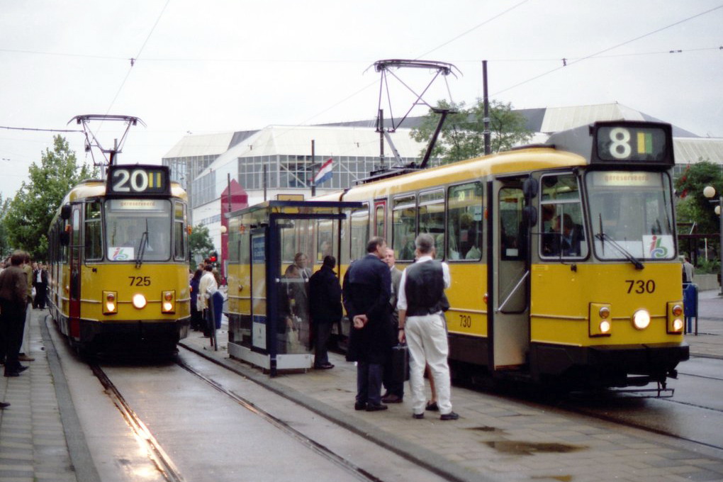 ![]() GVB 725 en 730, Lijn 20 en 8, Europaplein, 13 september 1996. Foto: Tim Castricum. |