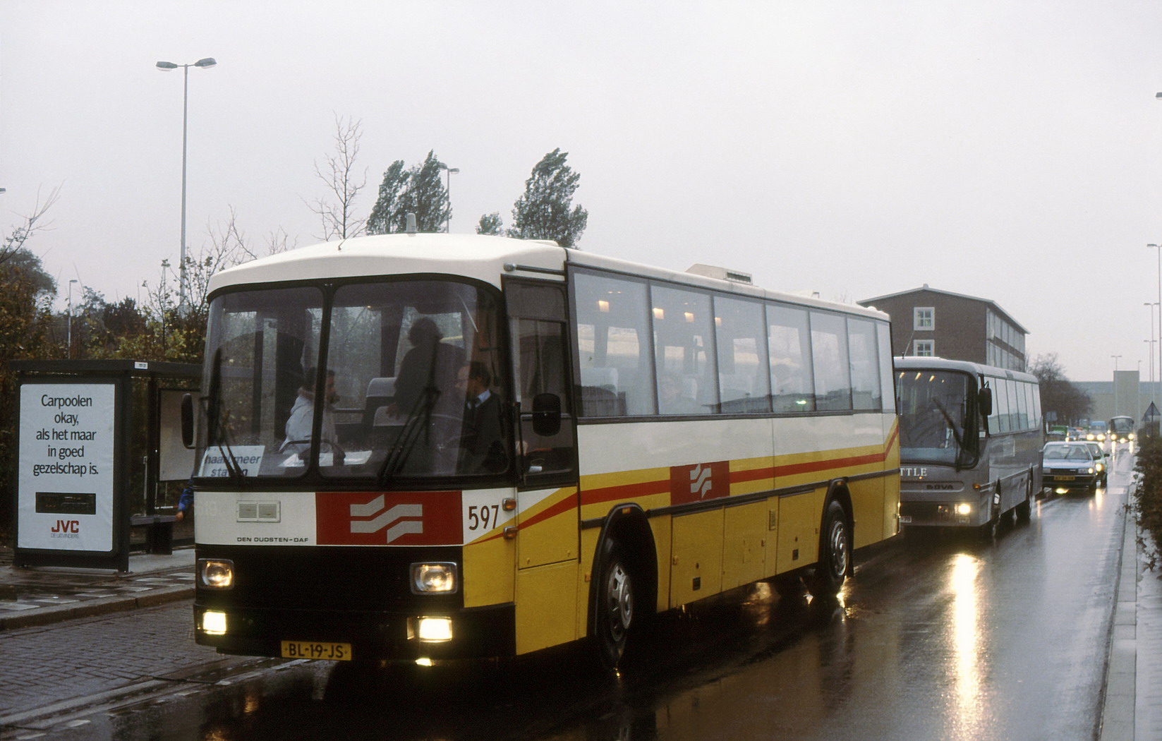 ![]() GVB 597, Lijn 221, Schiphol-Oost, Stationsplein, 26 oktober 1990. Tijdelijk ingehuurde Tourwagen van NZH tot de komst van de nieuwe reeks GVB Shuttlebussen. Foto: René van Lier. |