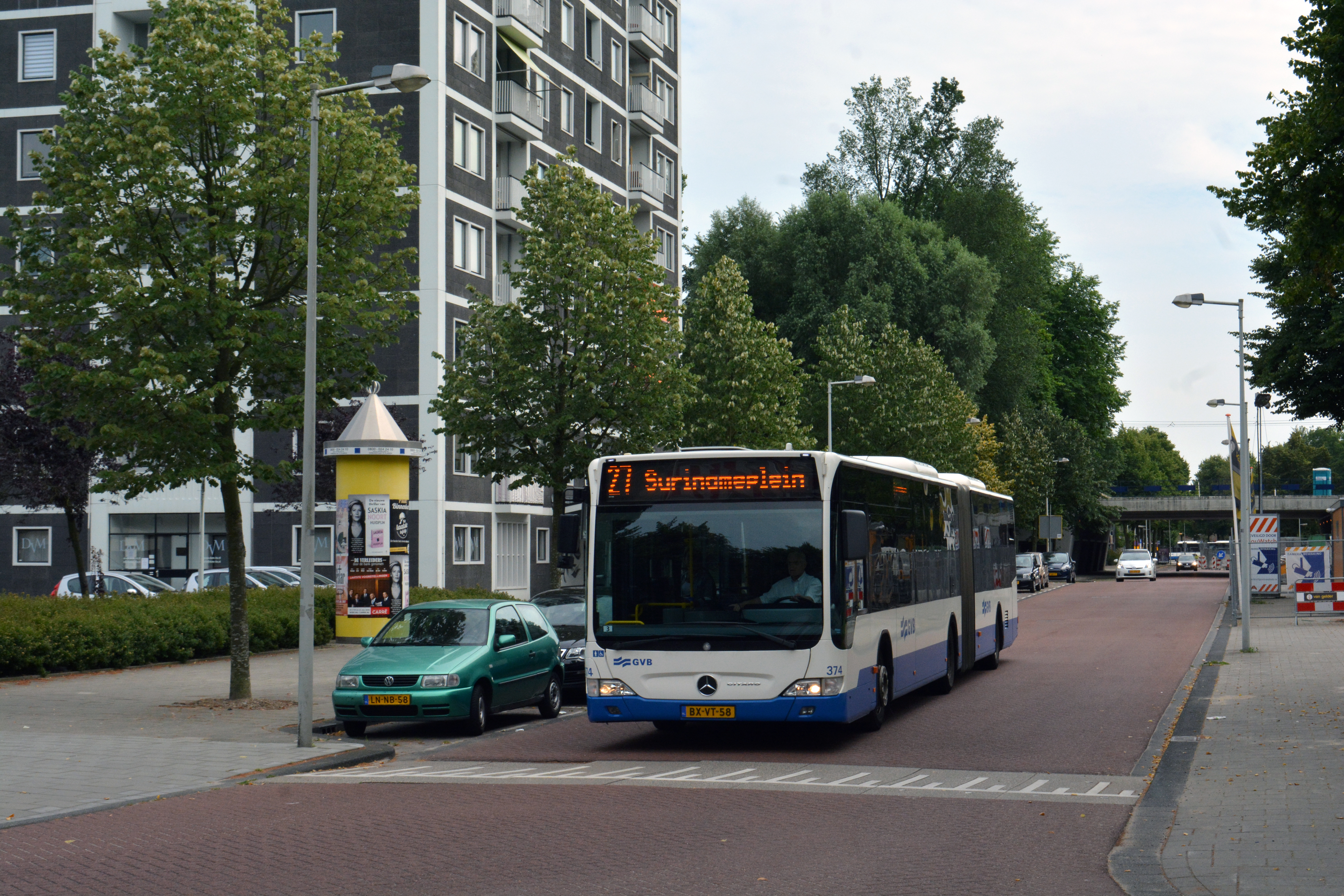 ![]() GVB 374, Lijn 27, Hemsterhuisstraat, 24 juli 2016. Foto: René van Lier. |