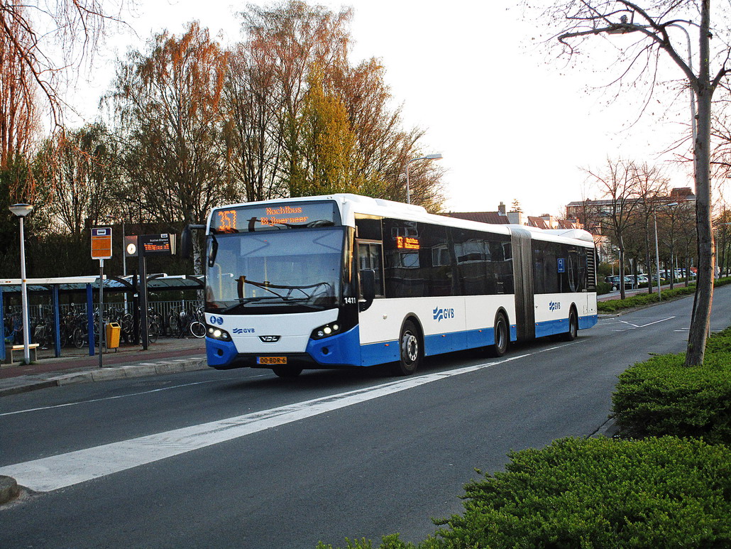 ![]() GVB 1411, Lijn 357, Diemen, Ouddienerlaan, 18 april 2015. Foto: Arthur Akkermans. |